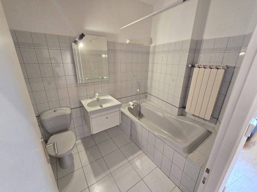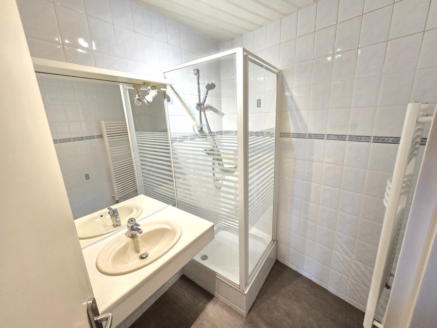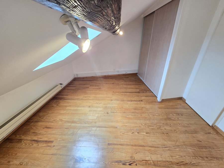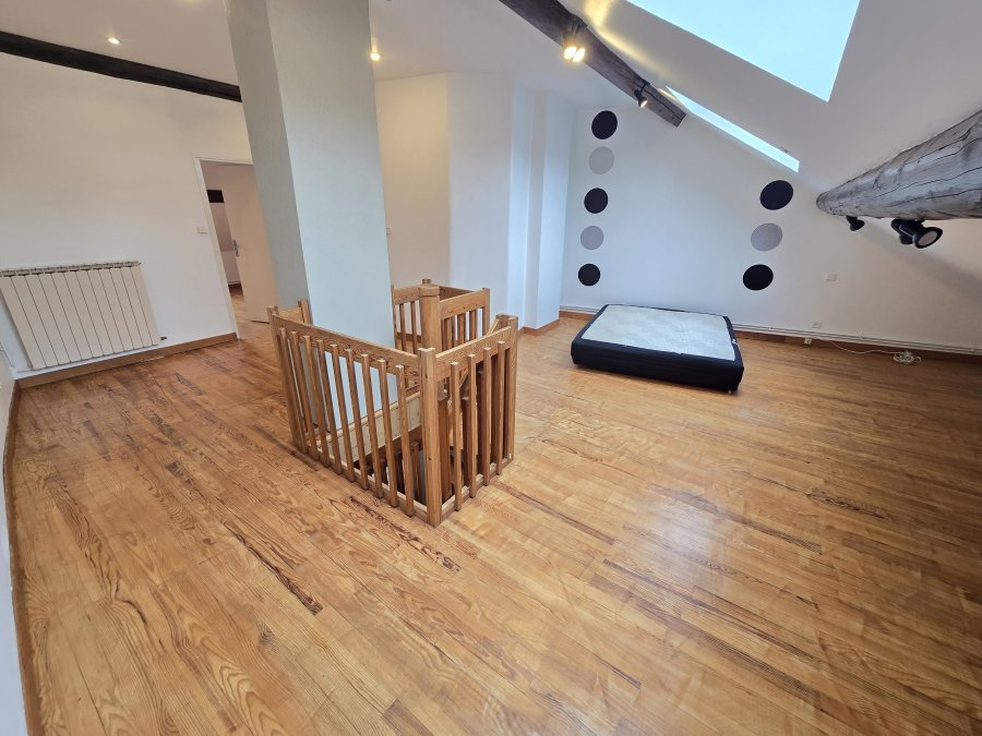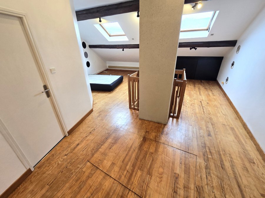 Une vaste chambre sur parquet de 38m² au sol divisible si nécessaire en 2, une salle bains carrelé avec baignoire et wc, une seconde chambre parquetée avec placards intégrés.