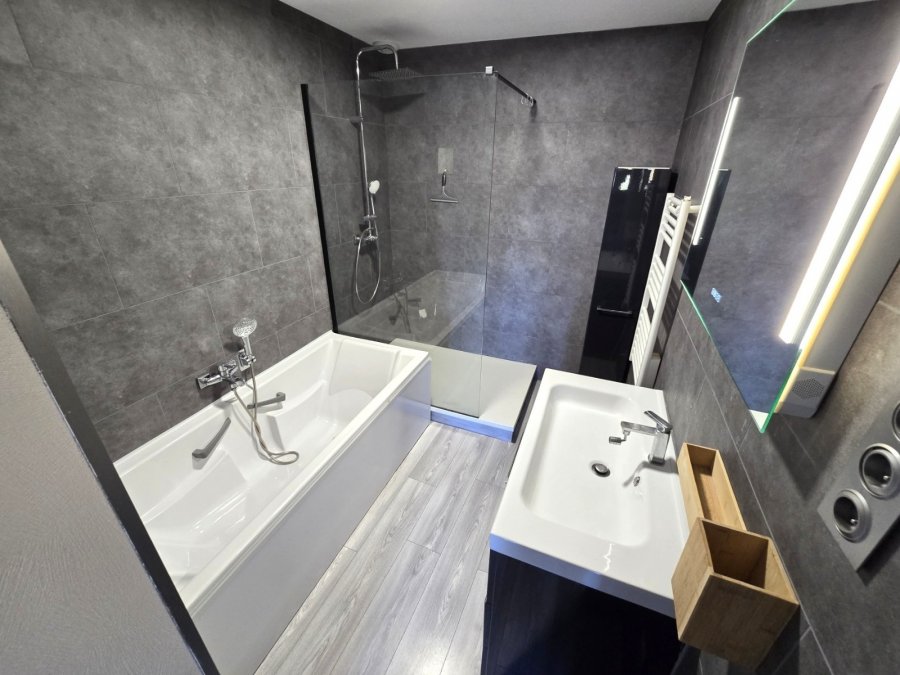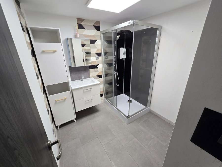 Un dégagement, 2 grandes chambres d'environ 20m² chacune au sol), salle d'eau avec douche meuble vasque et sèche serviette, wc séparé.